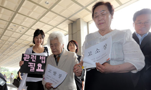 | 위안부 소녀상 모독 일본인 고소 위안부 피해 할머니 이옥선(앞줄 왼쪽), 이용수(〃 오른쪽)씨가 위안부 소녀상을 모독한 일본인 스즈키 노부유키를 명예훼손 등의 혐의로 고소하기 위해 4일 서울 서초동 서울중앙지검에 들어서고 있다. 스즈키는 지난달 서울 중학동 일본대사관 맞은편에 있는 위안부 소녀상을 ‘매춘부상’이라고 부르고 독도를 일본땅이라 주장하는 말뚝을 설치해 논란을 일으켰다. 연합뉴스 |