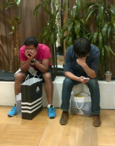 해당 사진에서 남성 두 명은 각각 쇼핑백을 바닥에 내려둔 채 휴식을 취하고 있다. 한 남성은 오랜 쇼핑에 지친 듯 양손으로 얼굴을 감싸 쥐고 있으며 또 다른 남성은 휴대전화를 만지며 여자친구를 기다리는 듯한 모습을 보여 남성 네티즌들의 공감을 얻었다.