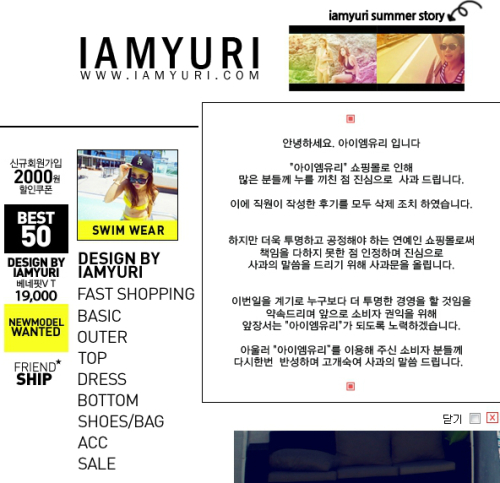 그는 또 "'아이엠유리' 임직원이 인터넷 쇼핑몰 공정거래에 대한 정보 부족으로 인해 사이트 활성화만을 염두하고 허위 후기를 남긴 점에 대해서는 모두 진심으로 반성하고 있다. 곧 사이트에도 사과문을 올릴 예정"이라고 전했다.