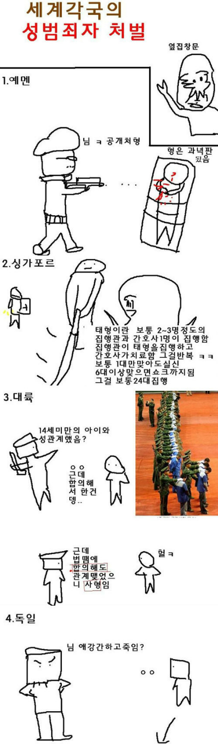 최근 한 온라인 커뮤니티에는 ‘세계 각국의 성범죄자 처벌’이라는 제목으로 카툰이 올라왔다. 해당 카툰에는 예멘, 싱가포르, 중국, 독일, 우리나라의 처벌 방식이 설명돼 있다.