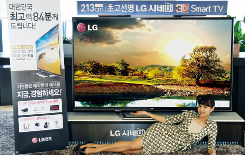 LG, 세계 최대 84인치 UDTV 출시 입력 : 2012-07-20 19:41:48 수정 : 2012-07-20 19:41:48 구글 네이버 유튜브 20일 LG전자 모델이 세계 최대인 84인치 초고해상도(UD) TV(모델명:84LM9600)를 소개하고 있다. LG전자가 한 달 동안 84대 한정으로 예약판매하는 이 제품은 침대 세로 길이(200㎝)보다 긴 213㎝이며, 가격은 2500만원으로 중형차 한대 가격과 맞먹는다. 풀HD(1920×1080)보다 4배 높은 3840×2160 해상도의 화질을 구현한다. LG전자 제공 Copyright ⓒ 세계일보. 무단 전재 및 재배포 금지