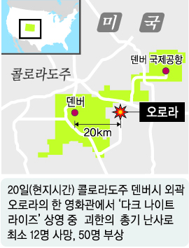 현지 라디오방송 KOA는 이날 덴버시에서 약 20㎞ 떨어진 교외 지역인 오로라의 한 극장에서 새 배트맨 영화 ‘다크 나이트 라이즈’가 상영되던 중 한 남성이 관객을 향해 최루탄 혹은 연막탄으로 보이는 물체를 던지고 무차별 총격을 가했다고 보도했다. 댄 오아츠 오로라 경찰서장은 “최소 12명이 사망하고 50명이 부상했다”며 “극장 옆 주차장에서 용의자 1명을 체포했다”고 밝혔다. 이어 “용의자는 방독면과 칼, 소총 1정, 권총 1정을 소지하고 있었다”고 설명했다. ABC 방송은 범인 이름이 제임스 홈스라고 보도했다.