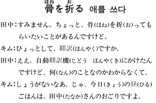 구글, 야후 등 다양한 웹 번역기가 있지만 아직 완벽하지 못해 돌려도 무슨 말인지 모를 경우가 많다. 骨(ほね)を折(お)る는 ‘골절하다’라는 말이지만 관용적으로 ‘애를 쓰다’라는 뜻으로도 많이 쓰인다.
