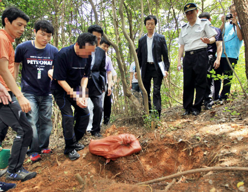 | 통영 초등생 살해 현장 검증 26일 경남 통영시 인평동의 한 야산에서 지난 16일 초등생 한아름(10)양을 살해한 김모(45)씨가 구덩이 속으로 시신을 유기하던 당시 상황을 재연하고 있다. 통영=연합뉴스 |