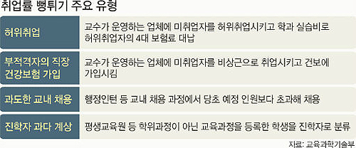 대표적인 적발 유형은 허위취업(16개 대학), 직장 건강보험 가입요건 부적격자의 건보 가입(7개), 과도한 교내 채용(3개), 진학자 과다 계상(4개) 등이다.