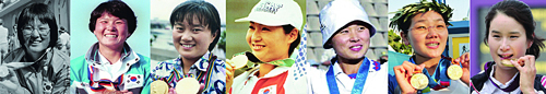 | 1984 로스앤젤레스(LA) 대회 이후 2008년 베이징 대회를 제외한 올림픽 여자 양궁 개인전에서 금메달을 딴 주인공들. 1984 LA 서향순, 1988 서울 김수녕, 1992 바르셀로나 조윤정, 1996 애틀랜타 김경욱, 2000 시드니 윤미진, 2004 아테네 박성현, 2012 런던 올림픽 기보배(왼쪽부터). 연합뉴스 |