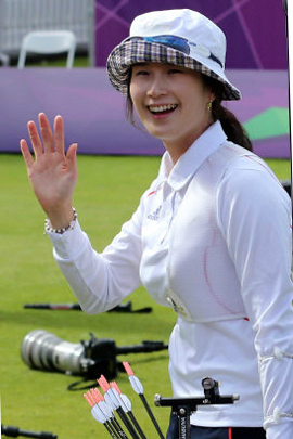 | 한국 여자양궁의 대들보 기보배가 2일(현지시간) 영국 런던의 로즈 크리켓 그라운드에서 열린 개인전 결승에서 금메달을 확정 지은 뒤 관중들의 환호에 손을 들어 화답하고 있다. 런던=올림픽 사진공동취재단 |