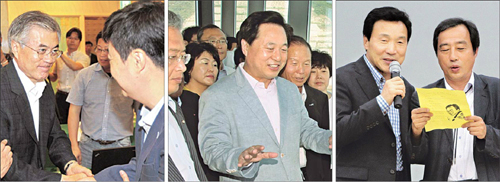 민주통합당 문재인 대선 경선 후보가 지난 3일 대구 제이스호텔에서 지역 언론인과의 간담회에 앞서 참석자들과 악수하고 있고(왼쪽 사진), 김두관 대선 경선 후보는 5일 전북 새만금 신시도 33센터를 방문하고(가운데), 손학규 후보는 이날 인천시청 대회의실에서 저서 ‘저녁이 있는 삶-손학규의 민생경제론’ 북콘서트를 열고 있다.
