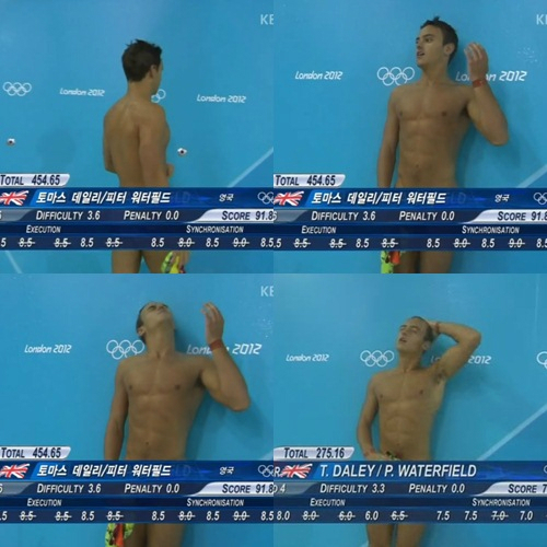 이는 2012 런던올림픽 남자 다이빙 경기로 선수들의 점수가 적힌 자막이 하단에 기재된 장면을 캡쳐한 사진이다. 공교롭게도 자막의 위치가 선수들의 수영복을 가려 마치 수영복을 입지 않은 것처럼 오해할 수 있는 장면이 연출돼 눈길을 끌고 있다.