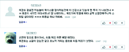 이날 오전 은메달을 딴 이대훈 선수(태권도 남자 58kg 이하)의 기사에는 격려보다 질타가 주를 이뤘다. ‘어떻게 국가대표에 뽑혔는지 보는 내내 답답했다’, ‘(대표)선발전은 제대로 치르고 나왔는지 의문이다. 초딩 겨루기하는 것 같았다’ 등 경기력을 문제삼는 글들이 이어졌다. ‘대훈이 파마 잘 나왔네. 미용실 차려 볼 생각 없나?’, ‘태권도 그만두고 아이돌이나 해라’는 등 경기와 상관없는 인신공격도 상당수였다.