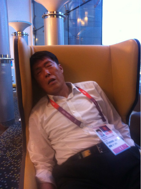 10일 배 아나운서는 자신의 트위터에 “밤 11시까지 한일전 분석하다가 호텔 로비 의자에서 실신. 이제 각자 방으로”라는 글과 함께 한 장의 사진을 게재했다.