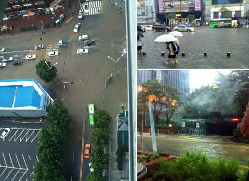 | 잠기고… 끊기고… 무너지고… 중부 물난리 15일 서울지역에 한때 시간당 50㎜ 안팎의 ‘물폭탄’이 쏟아지면서 지난해 집중호우로 침수 피해가 컸던 강남역 인근 도로가 다시 물에 잠겨 차량과 보행자가 통행에 큰 불편을 겪었다. 사진은 누리꾼들이 트위터에 올린 강남역 침수 장면. 연합뉴스 |