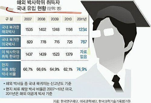 미국과학재단(NSF)에 따르면 해마다 미국에서 박사학위를 취득하는 한국인은 1400명 내외. 2007년의 경우 1437명이 박사학위를 받았지만 지금까지 704명만 국내에 복귀한 것으로 신고됐다. 2명 중 1명은 해외에 정착한 셈이다.