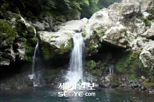 | 한라산 자락 돈내코 계곡의 원앙폭포는 제주 사람들이 가장 즐겨 찾는 피서지다. 젊은이들은 짙푸른 소(沼)를 헤엄쳐 건너가 얼음물같이 차가운 폭포수 아래서 늦더위를 잊는다. |