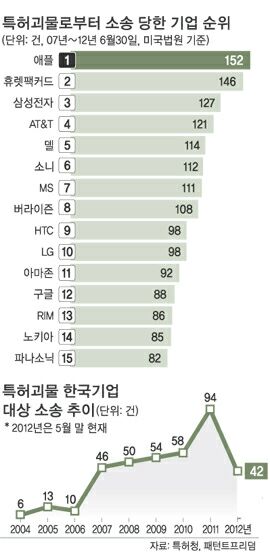 애플이 두려워하는 것은 삼성보다 특허괴물이다. 애플은 2007년부터 지난 6월 말까지 152건의 소송을 당해 특허괴물 소송에 휘말린 기업 1위를 달리고 있다.