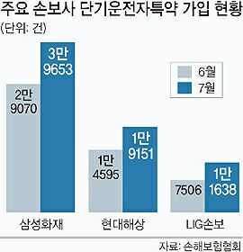 특약 가입이 쇄도한 것은 최소 2∼3일 이상이던 보험 특약기간이 지난 6월부터 하루 단위로 확대된 점도 요인으로 작용했다. 삼성화재의 경우 하루 특약이 시작된 이래 두달 동안 하루특약 가입자가 4만건을 넘어섰다.