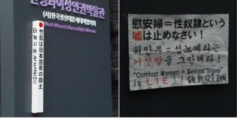 이들은 지난 22일 오전 8시30분께 서울 마포구 성산동 전쟁과 여성 인권박물관과 서대문구 미근동 동북아역사재단 입구에서 나무 말뚝 3개와 전단 한 장을 붙였다.