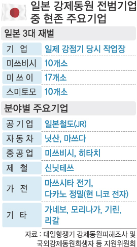 299개 기업에는 일본의 3대 재벌인 미쓰비시, 미쓰이, 스미토모 계열 기업과 히타치 중공업, 자동차업체인 닛산·마쓰다, 화장품업체 가네보, 맥주회사 기린, 가전업체 마쓰시타 전기가 포함돼 있다. 이들 기업은 일제 강점기에 동남아와 일본, 남태평양 군도, 한반도의 주요 광산, 군수공장, 발전소 공사장 등지로 조선인을 끌고 가 착취했다. 사실상 ‘전범 기업’이라고 할 수 있다.