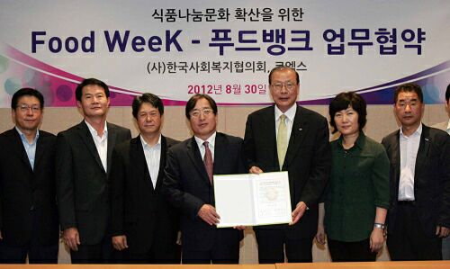 30일 지역사회 소외계층을 위한 식품나눔 ‘푸드뱅크’와의 업무 협약 약정을 체결한 ㈜코엑스는 Food Week 2012 행사를 통해 온라인 티켓 판매금 전액을 푸드뱅크에 기부할 예정이며, 행사 기간 동안 푸드위크에 참가하는 식품 기업체들과 관람객들 대상으로 푸드뱅크를 통한 기부를 홍보할 예정이다.