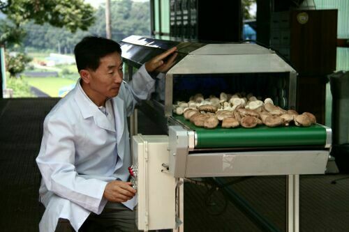 | 버섯 비타민 D2 증진기를 발명한 박상돈 천안시농업기술센터도시농업팀장이 장치에서 버섯을 가공하고 있다. |