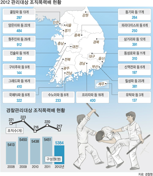 4일 경찰청에 따르면 경찰이 관리대상에 올려두고 정보를 수집하거나 수사대상으로 삼고 있는 조직폭력배는 올해 기준 전국적으로 5384명에 달한다. 여기다 준조직폭력배나 조직폭력배 의심자까지 더하면 8000명에 육박할 것으로 경찰은 추산하고 있다.