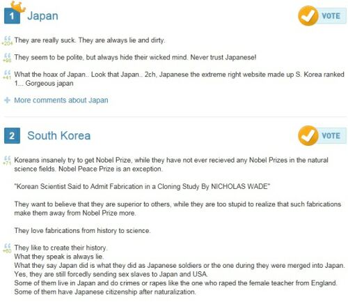 8일 오후 3시30분 현재 '가장 싫어하는 나라' 1위에는 일본이 올라있다. 2위는 한국, 3위는 북한이 올랐고, 중국이 4위를 기록하는 등 동북아시아 국가들이 상위권에 랭크되는 불명예를 안았다.