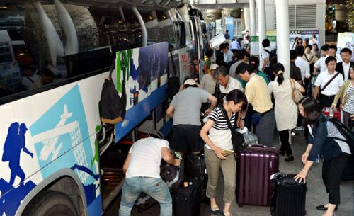 | 문선명 통일교 총재 빈소를 직접 찾으려는 일본 참배객들이 항공권을 구하지 못해 어려움을 겪고 있다. 사진은 지난 5일 오후 인천국제공항을 통해 입국한 일본인 참배객들이 ‘문선명 천지인참부모 천주성화식’이 열리는 경기도 가평 청심평화월드센터로 이동하기 위해 버스에 짐을 싣는 모습. 인천공항=이재문 기자 |