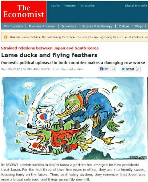 이코노미스트 온라인판도 8일 ‘레임덕과 나는 깃털’이라는 제목의 기사에서 이 대통령의 독도 방문 등과 관련해 “한국의 역대 대통령들이 집권 3년차까지는 일본에 우호적 행보를 보이다가 임기말 갑자기 적대적으로 돌아서는 패턴을 반복하고 있다”면서 한·일 갈등의 주된 책임을 한국에 돌렸다.