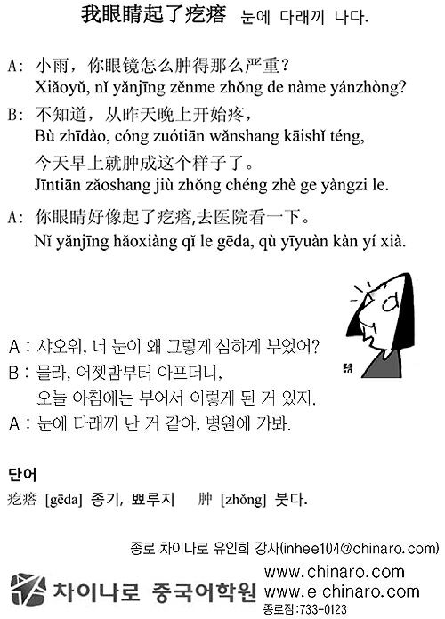 [生生 중국어 한마디] 눈에 다래끼 나다. 입력 : 2012-09-12 17:53:01 수정 : 2012-09-12 17:53:01 구글 네이버 유튜브 Copyright ⓒ 세계일보. 무단 전재 및 재배포 금지 세계일보