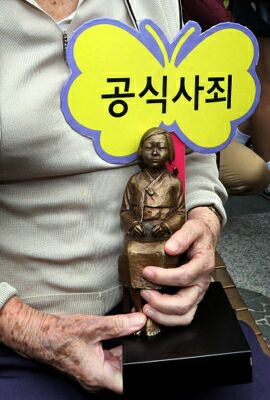 | 할머니 품에 안긴 위안부 소녀상 12일 서울 종로구 중학동 일본대사관 앞에서 열린 위안부 문제 해결을 위한 정기수요집회에 참가한 길원옥 할머니 품에 작은 위안부 소녀상이 안겨 있다. 연합뉴스 |