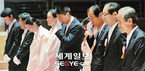 문선명 총재 성화식을 하루 앞둔 14일 경기도 가평 청심평화월드센터에 마련된 빈소에서 유족들이 고인의 영정에 참배하며 눈물을 흘리고 있다. 문 총재에 대한 참배는 이날로 마무리됐다.