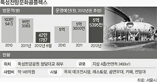 시는 당초 전망문화콤플렉스를 개장하며 “한강을 찾는 시민들이 다양한 형태의 문화·전시 공연을 즐길 수 있게 됐다”며 “한강의 가장 아름다운 모습을 보기 위해 꼭 거쳐 가야만 할 상징적인 공간이 될 것”이라고 설명했다.