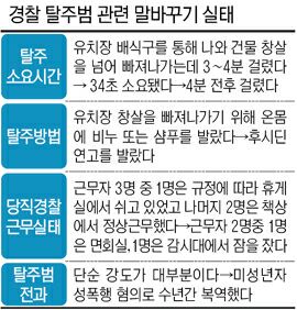 이밖에 경찰은 탈주범이 17일 오전 5시 유치장을 벗어난 뒤 2시간이 지난 오전 7시35분쯤에야 도주 사실을 확인했다고 발표했으나 CCTV 확인 결과 오전 6시10분쯤 동부경찰서 상황실 부실장 한모(54) 경위가 유치장 감독 순시를 했으나 세밀히 살피지 않아 도주사실을 확인하지 못한 것으로 드러났다.