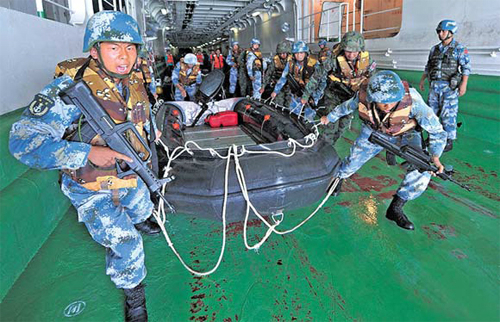 | 최근 동중국해에서 실시된 섬 탈환 훈련에 참가한 중국 해군 육전대(해병대) 대원들이 상륙함에서 고무보트를 끌어내면서 구호를 외치고 있다. 출처:중국망 |