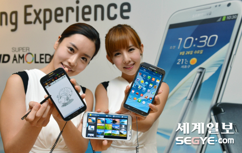 26일 오전 서울 서초사옥에서 모델들이 '갤럭시노트2'를 선보이고 있다. '갤럭시노트2'는 전작보다 커진 5.5인치 대화면에 1.6GH 쿼드코어 프로세서와 3,100밀리암페어시의 대용량 배터리를 탑재했으며 노트필기 기능인 'S펜'의 사용성이 대폭 강화된 것이 특징이다.