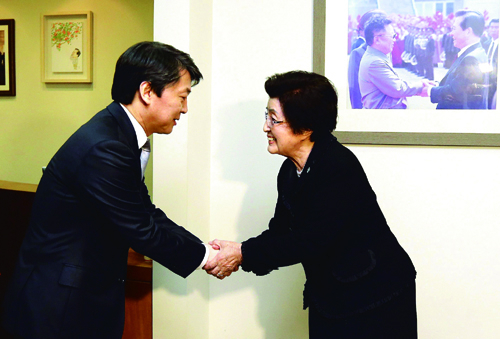 안 후보는 이날 동교동 김대중도서관에서 이 여사와 호남 방문 일정과 남북평화 문제를 주제로 대화를 나눴다. 비공개로 진행된 이날 대화에서 이 여사는 “야권이 통일돼 한 사람이 나와서 여당과 싸워 꼭 이겨야 한다”는 취지의 언급을 했다고, 안 후보 측이 전했다.