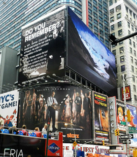 | “日 위안부 사죄하라” 뉴욕 타임스스퀘어에 광고 ‘기억하는가?’(DO YOU REMEMBER?) 위안부 문제를 망각한 일본을 꾸짖으며 사죄를 촉구하는 내용의 옥외 광고가 3일(현지시간) 미국 뉴욕 한복판의 타임스스퀘어에 처음으로 등장했다. ‘DO YOU REMEMBER?’라는 제목의 이 광고는 빌리 브란트 전 독일 총리의 사진을 배경으로 “1971년, 브란트 총리가 폴란드에서 사죄해 유럽 평화에 크게 기여했다. 2012년, 성 노예를 강요받았던 한국의 할머니들은 아직도 일본의 진심 어린 사죄를 기다리고 있다”는 메시지를 알리고 있다. 한국 홍보 전문가 성신여대 서경덕 교수가 기획하고 가수 김장훈이 후원한 위안부 광고는 12월 말까지 게재될 예정이다. ISEA 커뮤니케이션스 제공 |