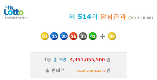 10월 첫째 주 토요일인 6일 나눔로또 514회 추첨결과, 로또복권 1등 당첨번호는 ‘1, 15, 20, 26, 35, 42’ 보너스 9로 결정됐다.