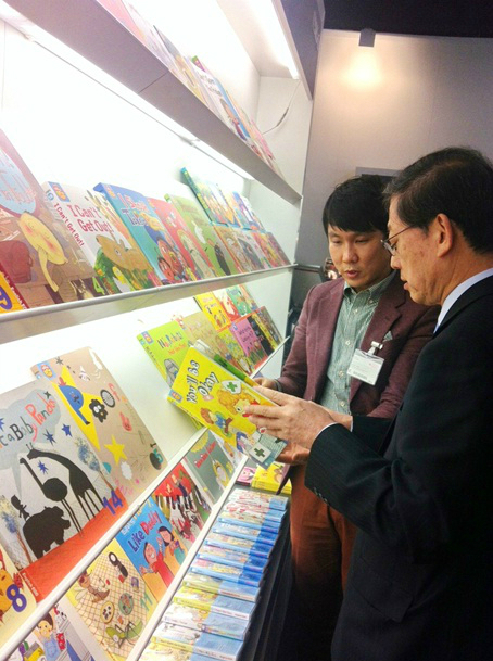 | 2012 프랑크푸르트 도서전을 찾은 김황식 국무총리가 잉글리시 에그 부스에서 교재를 살펴보고 있다. |