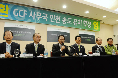 | 이명박 대통령(왼쪽 세번째)이 20일 녹색기후기금(GCF) 사무국 유치가 확정된 직후 인천 송도 컨벤시아 기자회견장을 찾아 인사말을 하고 있다. 왼쪽부터 한덕수 무역협회장, 박재완 기획재정부 장관, 이 대통령, 송영길 인천시장. 청와대사진기자단 |