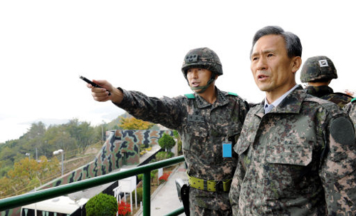 | 북한의 임진각 타격 위협으로 군사적 긴장이 높아진 가운데 김관진 국방장관이 20일 오전 철원 중부전선의 최전방 부대를 방문해 군의 대비태세를 점검하고 있다. 연합뉴스 |