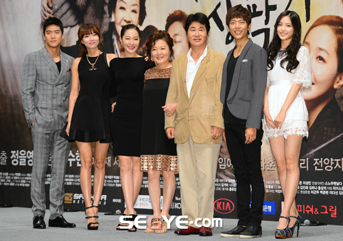 22일 오후 서울 논현동 임피리얼팰리스 호텔에서 열린 Jtbc 주말 드라마 '무자식 상팔자' 제작발표회에 배우 하석진, 오윤아, 엄지원, 김해숙, 유동근, 이도영, 손나은(왼쪽부터)이 참석해 포즈를 취하고 있다.