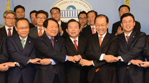 | 손 맞잡은 새누리·선진 새누리당 황우여 대표(앞줄 오른쪽 두 번째)와 선진통일당 이인제 대표(앞줄 가운데)가 25일 국회 정론관에서 합당 발표 기자회견을 한 뒤 손을 엇갈려 잡고 하나가 됐다는 포즈를 취하고 있다. 이제원 기자 |