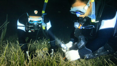 | ‘환경스페셜’ 제작진이 해양 생태계의 바로미터인 잘피밭에서 다양한 생물종을 관찰하고 있다. |