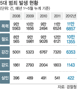 경찰청은 31일 ‘폭력범 집중단속하자 살인·강도 줄어’란 자료를 통해 지난 6월20일부터 이날까지 펼친 ‘5대폭력 척결’ 성과를 발표했다.