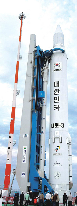 | 지난 26일 발사 예정이었다가 설비 이상으로 발사 연기된 나로호(KSLV-Ⅰ)가 발사대에 세워졌을 때의 모습. 세계일보 자료사진 |