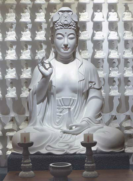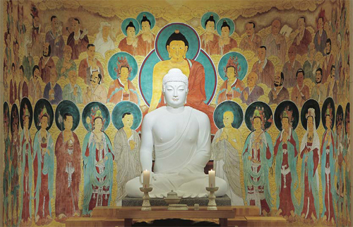 | 전등사 무설전의 석가모니불 좌상과 불화. 금색 대신 흰색 도료를 칠한 불상이 인상적이다. 불상 뒤 벽화는 서구식 프레스코 기법으로 그렸다. 전등사 제공 |