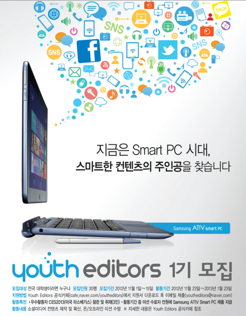 30명 중 미션을 완료한 대학생에게는 스마트PC가 상품으로 증정되며, 특히 우수 활동자로 선발된 3인에게는 내년 1월 미국 라스베가스에서 열리는 세계 최대 가전쇼 ‘CES 2013’ 참관 및 취재 기회가 주어진다. 자세한 활동 내용과 지원 방법은 유스 에디터 공식 카페(http://cafe.naver.com/youtheditors)에서 확인할 수 있다.