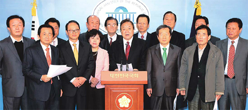 | 정대철 상임고문(가운데) 등 민주통합당 전직 의원들이 16일 국회 정론관에서 기자회견을 열어 당원들이 민주당 문재인, 무소속 안철수 후보에 대해 자유롭게 지지를 선택할 수 있도록 해야 한다고 요구하고 있다. 연합뉴스 |