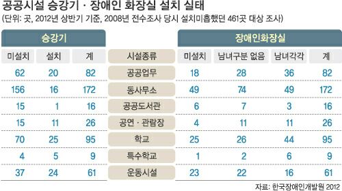 이들 시설은 2008년 보건복지부의 장애인 편의시설 전수 실태조사(공공시설 1만7892곳) 당시 ‘적정설치율’이 65∼70% 이하로 조사돼 장애인 배려가 특히 미흡하다고 지목됐던 곳이다. 적정설치율이란 실제로 장애인이 사용할 수 있게 시설물이 돼 있는지를 따지는 개념이다.